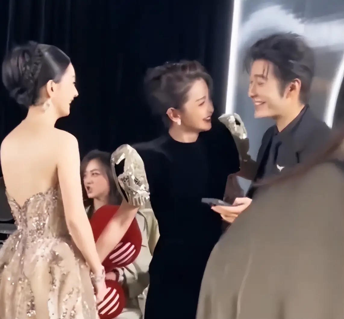 去年微博之夜的后台,有网友拍到李冰冰、赵丽颖和黄晓明三人窃窃私语的画面。