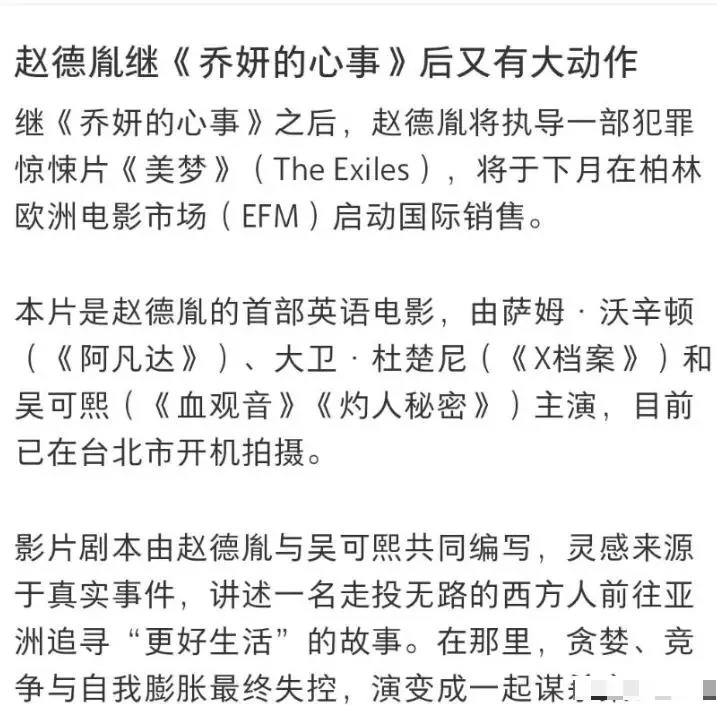 因此,随着近日赵德胤被曝将有新作犯罪惊悚片《美梦》,赵丽颖不免又卷入其中。