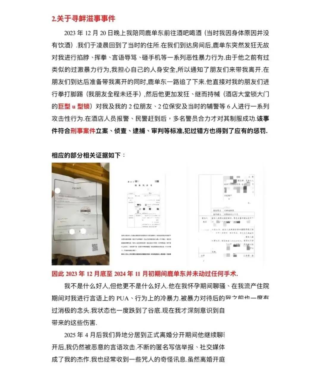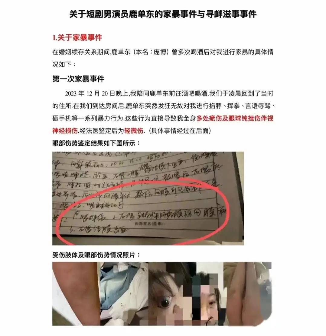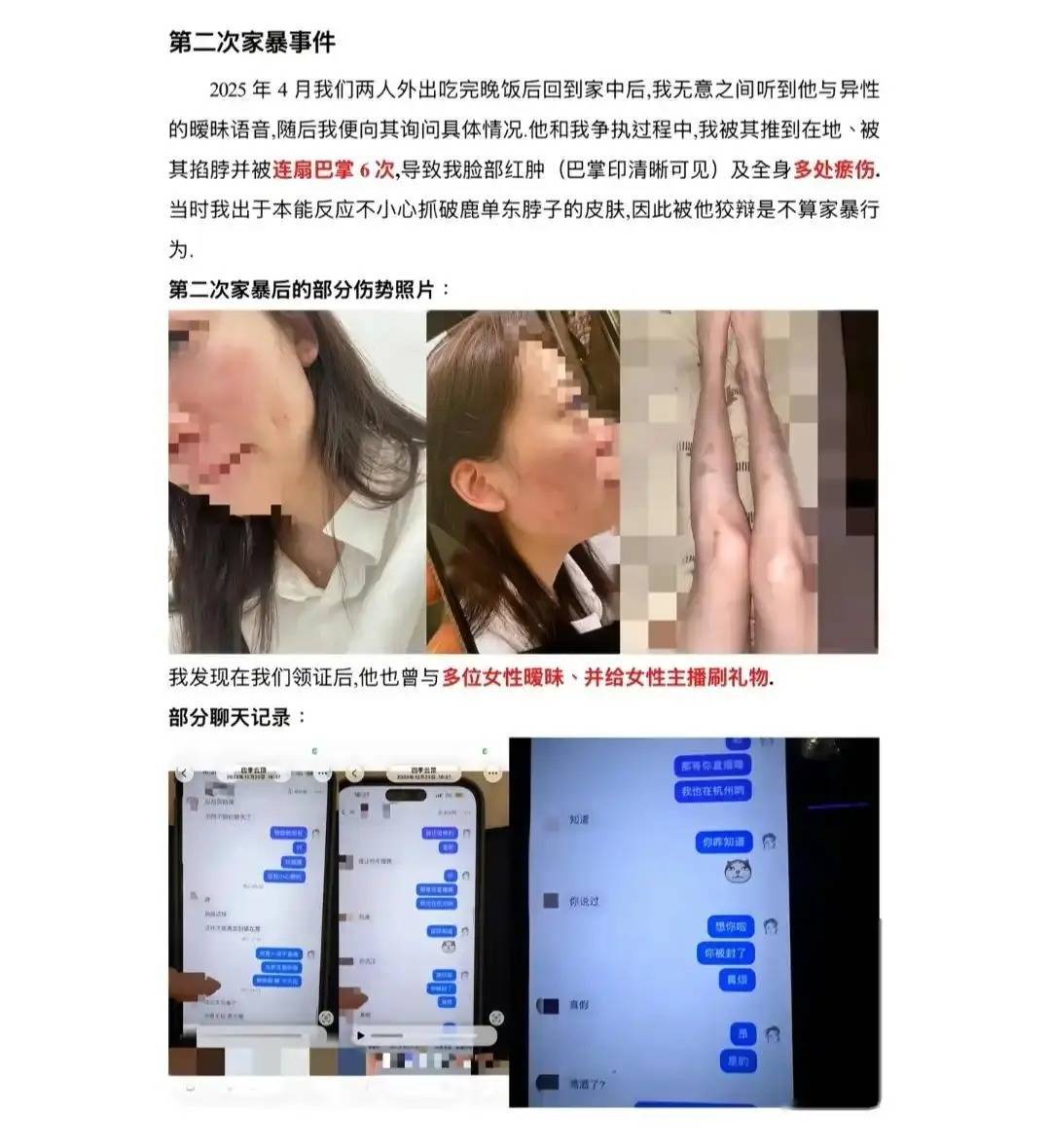 在婚姻期间,爆料人称自己遭受了两次家暴,第一次发生在2023年12月20日,当时两人因为一些琐事发生了争执,鹿单东一时情绪失控,对她进行了殴打,导致她受伤,经过法医鉴定,爆料人所受的伤害被认定为轻微伤。