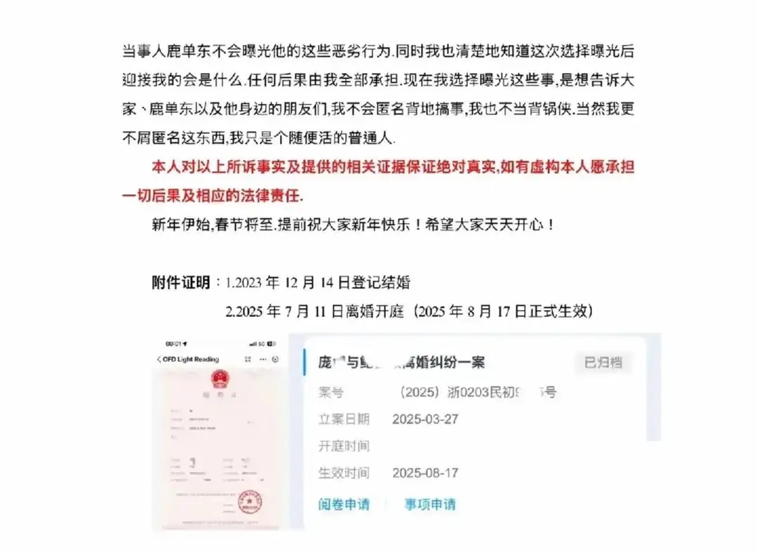 一、鹿单东的家暴指控 1. 家暴事件时间线根据爆料人的说法,她和鹿单东于2023年12月14日结婚,但两人的婚姻生活并不幸福,频繁的争吵和矛盾让她倍感压力,最终选择了离婚,而离婚时间则定在了2025年8月17日。